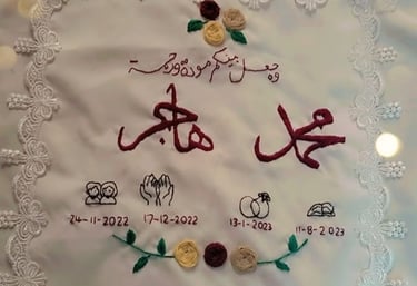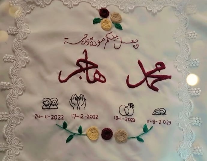 مناديل مطرزة بأناقة، مخصصة بأسماء وتواريخ، لتكون لمسة راقية تُزين المناسبة.